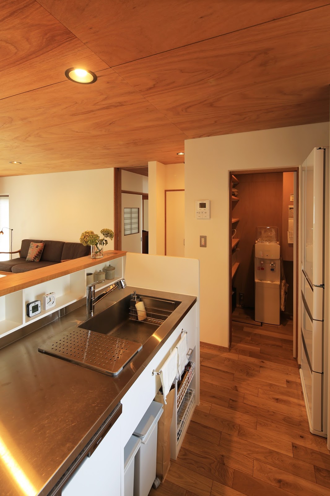 写真右奥はパントリー。面積的に余裕があればキッチンに隣接してパントリーを設けます。たまにしか使わない食器や電化製品、冷蔵庫に入れるほどではない食品などさまざまなものが収納できて便利ですが、こちらの家のようにウォーターサーバー置場として使っていらっしゃるケースは初めて見ました。